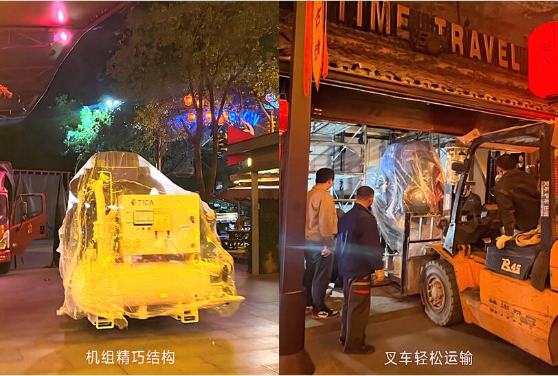 其乐精巧的结构设计充分考虑改造场景需求,长宽高仅2035*1150*2250cm,叉车轻松运输“丝滑进场”,同时,模块化组合设计使得单台机组占地面积比有油机组减少50%,替换安装简便高效。