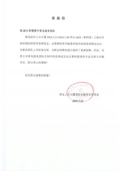 作为2025(第四届)上海合作组织国际投资贸易博览会举办场地,对空调运行稳定性要求极高。会展期间,海尔磁悬浮制冷机组始终保持高效稳定运行。同时,青岛海尔智慧楼宇售后服务小微人员驻场支持,以专业调试将设备的最优一面展示于用户,收获了无限好评。