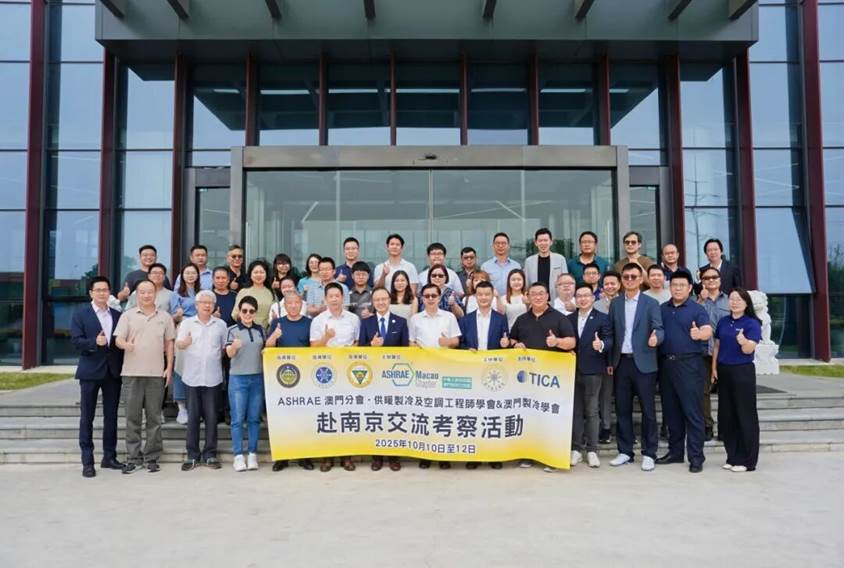 2025年10月10-12日,澳门制冷学会、ASHRAE澳门分会一行30余人在会长黄承发、秘书长杨树森率领下,由中国制冷学会副秘书长荆华乾陪同,来访南京天加环境科技有限公司。天加环境COO吴小泉、市场推广部总监王菲、香港分公司总经理杨钟义,江苏省科学技术协会党组成员、副主席冯少东、江苏省制冷学会理事长张建忠、秘书长黄浩良及多位领导,热情接待了来访嘉宾。