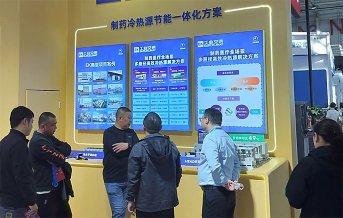 展位现场重点展示HEAD分布式云智慧高效集成冷站、四管制冷热平衡机、EKHP120余热回收高温热站、中低温再生高效转轮除湿系统、洁净型低碳恒温恒湿机组等多款核心产品,并搭载EK工业空调自主研发的EK-AIoT工业物联网能源优化平台,构建EK制药厂房节能降碳路线,以实实在在的节能数据与系统价值,吸引大量与会嘉宾驻足交流。