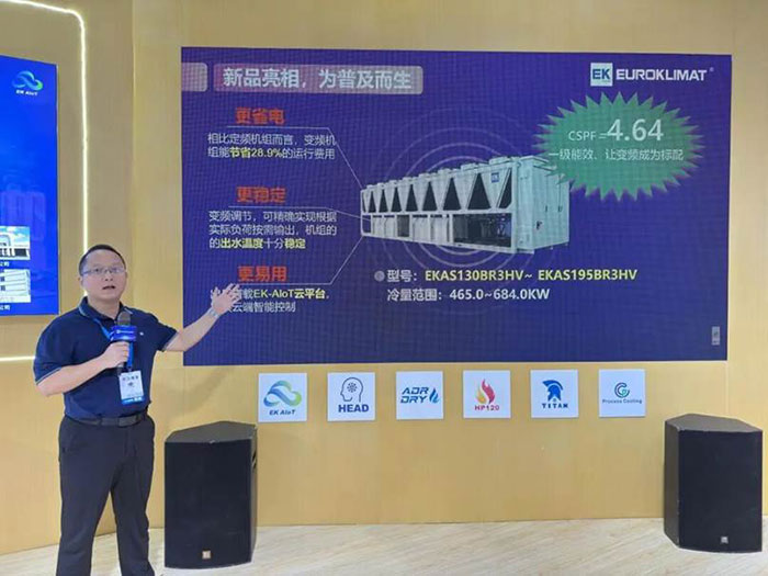 ▲EK工业冷热源系统事业部产品经理朱晓广现场宣布“雷霆”系列变频风冷螺杆机组新品发布并做方案介绍。
