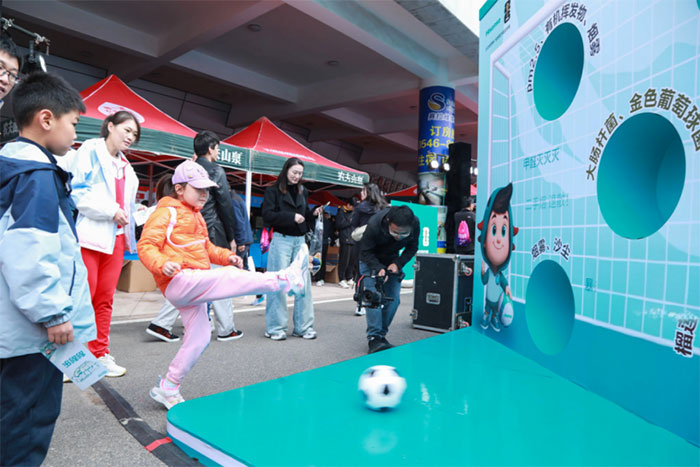 在骑行电单车游戏区域,跑友们跨上虚拟电单车,奋力骑行,点亮灯带并保持30秒,即可挑战成功,唤醒跑步呼吸活力;作为2026世界杯全球官方指定空调,展区特别设立了世界杯足球体验互动区,跑友们只要踢进2球,就能挑战成功,大家纷纷一展球技,踢出属于自己的精彩。
