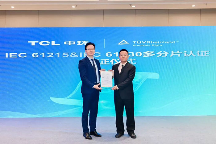 在本次大会的重要环节,TÜV莱茵全球电力电子产品服务副总裁兼大中华区太阳能与商业产品服务副总裁李卫春向TCL中环颁发IEC 61215与IEC 61730多分片技术光伏组件认证证书。该认证不仅是对TCL中环近十年深耕多分片技术成果的权威认可,更标志着其技术成熟度与产品可靠性已达到国际标准,为全球市场拓展提供了强力支撑。
