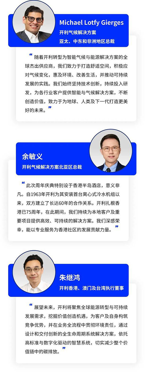 10月17日,开利香港75周年庆典活动在香港半岛酒店隆重举行,近百位重要客户与合作伙伴齐聚一堂,共同见证这一重要里程碑。从1950年进入香港市场至今,开利始终坚持创新,践行可持续,陪伴港澳共同成长。