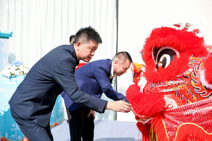 仪式现场,海信日立公司华东大区总监刘岩与苏州力一总经理邢伟共同为舞狮点睛,寓意苏州城市会客厅开业后“开门大吉、业绩长虹”;随后,嘉宾们共同登台执剪,在现场热烈掌声中,一同见证这一苏南暖通行业的重要时刻。