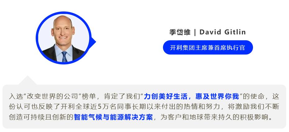 开利荣幸入选《财富》(Fortune)杂志“2025改变世界的公司榜单”,这是对开利长期以来将可持续发展融入企业基因、通过创新节能技术应对全球气候挑战的充分肯定。