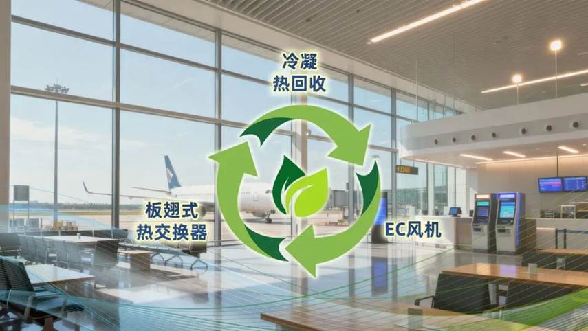针对大型空调系统高能耗痛点,多项技能技术和部件应用在机组中。机组内部配置板翅式热交换器,回收排风中蕴含的能量,通过紧凑的换热结构,充分回收排风能量,热回收效率达到70%以上;在除湿模块中,机组通过冷凝再热技术将冷凝废热充分二次利用,搭配高精度膨胀阀进行精细调节,实现再热量无级输出,精准匹配热量需求避免能量浪费的同时降低额外供热能耗;机组配置节能型 EC 风机,采用AMCA 权威认证的专业软件,通过精准计算匹配机组参数,确保风机高效输出。通过转速无级调节精准适配不同人流量时的风量需求。这些节能技术和部件的应用显著降低系统运行能耗,既提升了能源利用效率,又为长期运行节省费用,适配航站楼大能耗场景的节能需求。