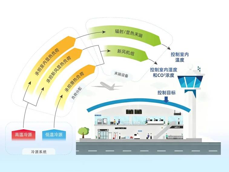 遥墙机场航站楼采用温湿度独立控制(THIC)系统,这是近年来高效节能空调领域的前沿技术,系统将温度与湿度控制彻底分离,由显热末端与冷凝除湿新风机组分别承担温湿调节任务,从根本上解决了传统集中空调“热湿耦合”造成的能耗浪费与控制不稳问题。