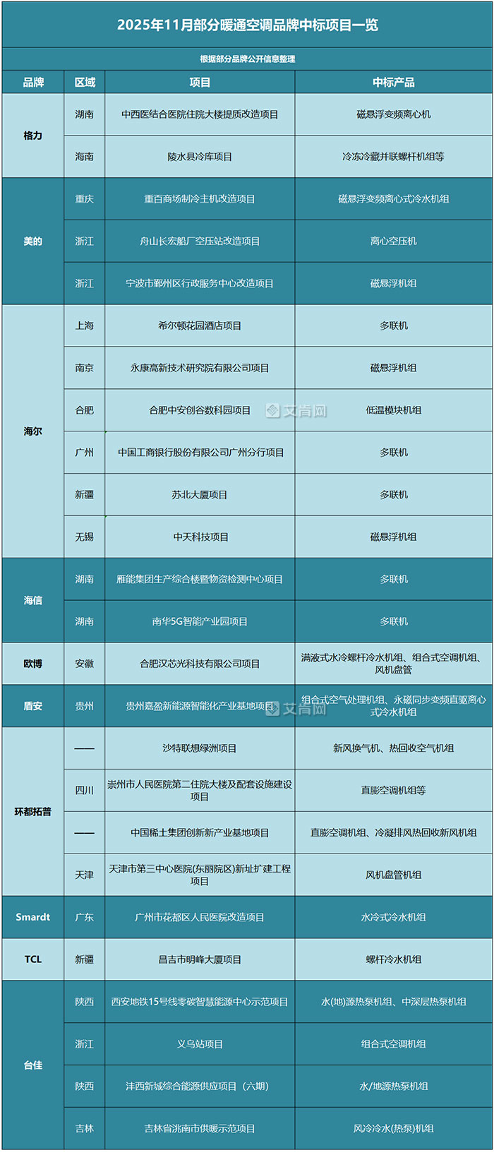 2025年11月部分暖通空调品牌中标项目一览