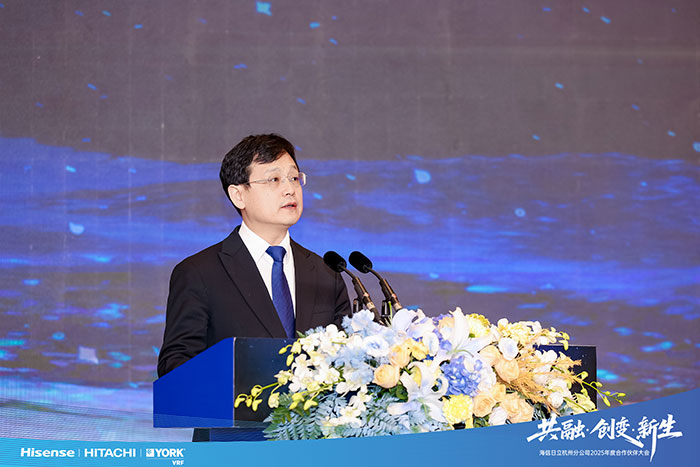 会议伊始,海信日立副总裁、营销公司总经理王学斌先生在大会致辞中首先对各位伙伴风雨同舟的鼎力支持表示衷心感谢。王学斌指出,在面对2025年宏观环境压力下国内中央空调市场“头部主导、结构分化”的格局,海信日立凭借前瞻性技术布局、坚韧渠道体系及精准把握“双碳政策”逆势领跑,这份韧性成绩,是对长期主义坚守、产品技术深耕的最佳回馈,更是全体合作伙伴携手共进实力的印证。