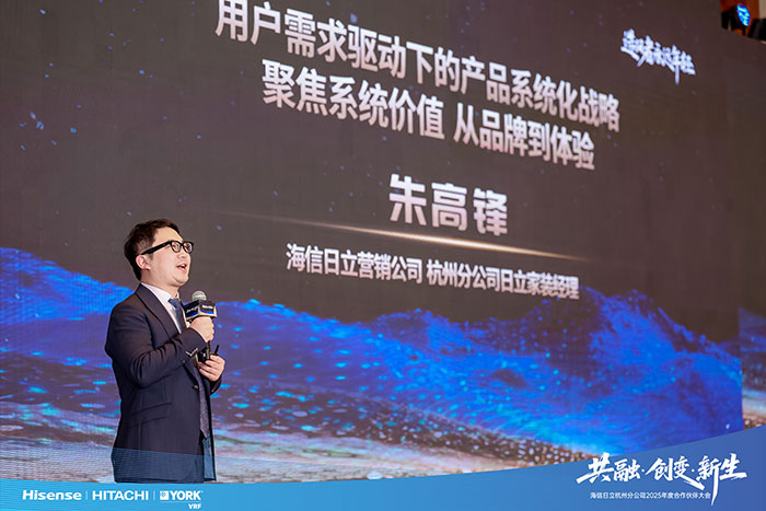 回归用户,构建系统化价值体系,已成为行业共识与竞争焦点,海信日立杭州分公司日立家装部经理朱高锋聚焦终端落地,发表《回归用户,构建价值》的主题演讲,从健康品质化、居家艺术化、深度智能化、存量换新化四大消费趋势出发,阐述海信、日立中央空调、约克VRF三大品牌如何以用户为原点构建价值链,实现从单一产品向智能化、定制化整体方案的跃迁,并将继续以领先的产品技术、解决方案,为用户提供美好空间体验。