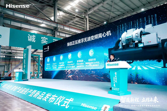 海信日立水机营销部总经理高连刚介绍了此次重磅发布的海信正压液浮无油变频离心机,已获得国家级权威认证,实现了能效行业领先、航天级可靠品质、全场景适配、绿色舒适运行,并通过联动ECO-B智慧运维平台,实现数字化高效管控。海信以技术创新构建起三大无油离心机生态,覆盖各容量建筑及旧改的全场景布局,助力建筑节能降碳。