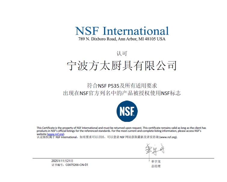 NSF制定的产品安全检测认证标准被称为行业的黄金标准,其权威性和严谨性备受全球认可。很荣幸能够获得NSF P535认证,这也印证了方太产品在安全性与功能性上的卓越表现。我们将持续通过技术创新,为用户提供更安心、更健康的饮水解决方案。