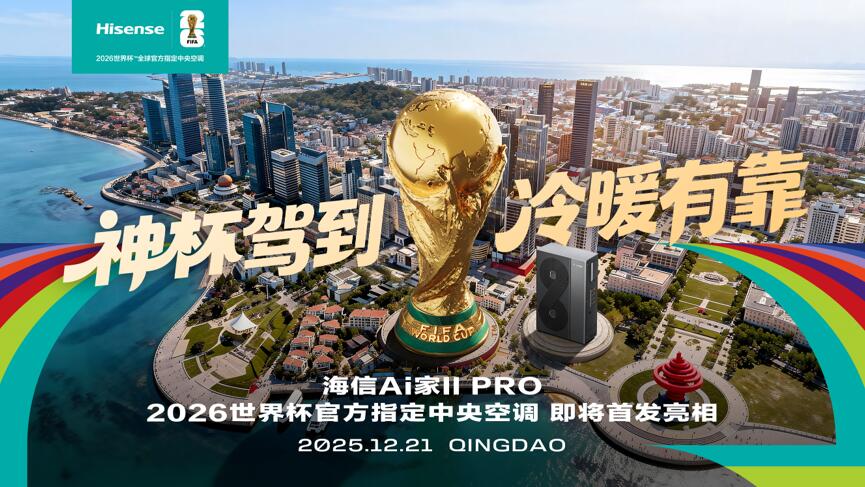12月21日,作为2026年世界杯官方赞助商,海信将邀请象征足坛最高荣耀的“大力神杯”来到中国,并在青岛奥帆中心面向公众免费展出。届时,海信2026世界杯全阵容定制产品将重磅亮相,官方定制中央空调海信Ai家II PRO亦将和观众见面,以全新风采与传奇同框,为热爱加温。
